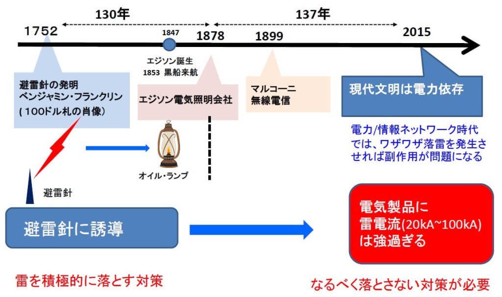 従来の避雷針は、積極的に落雷させる仕組みでした。しかし、デジタル機器が増えた現代において落雷は機器の故障を招き、社会に悪影響を及ぼします。